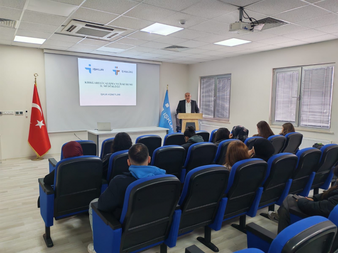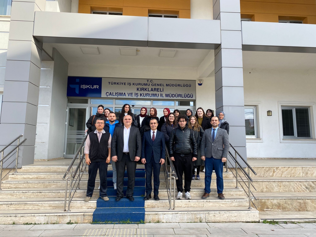 Sosyal hizmet kuruluşları dersi kapsamında 22 Aralık 2025 tarihinde Kırklareli Çalışma ve İş Kurumu (İŞKUR) İl Müdürlüğüne ziyaret gerçekleştirildi. Ziyarete öğrencilerle birlikte dersin sorumlusu Doç. Dr. Yasin ALYILDIZ ve Arş. Gör. Sibel VURKUN ÇAVDAR katıldı. Öğrenciler İŞKUR hizmetlerine yönelik yapılan sunumu dinledikten sonra kurumdaki birimleri gezerek meslek elemanlarından hizmetlere dair bilgi aldılar. Fotoğraf çekiminin ardından ziyaret son buldu.