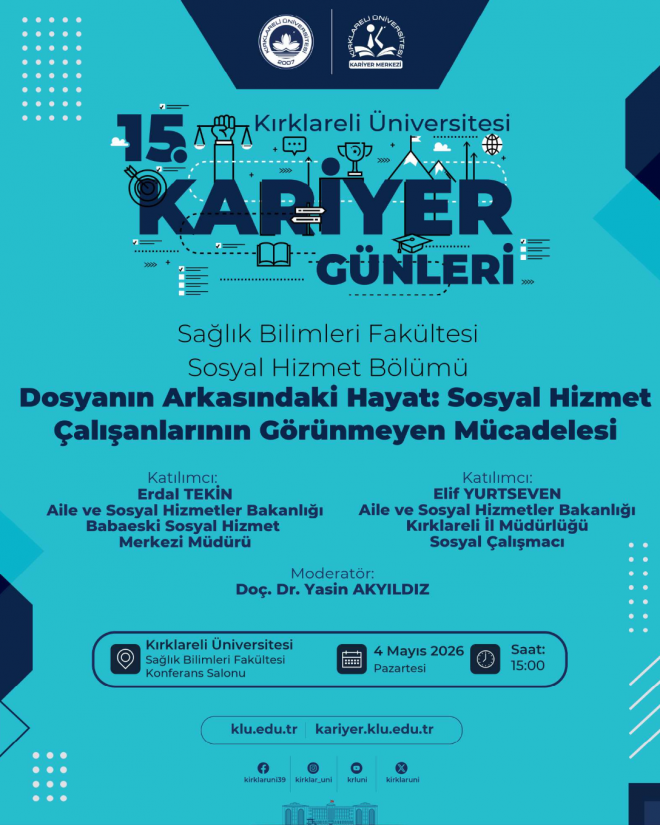 Kırklareli Üniversitesi Sağlık Bilimleri Fakültesi Sosyal Hizmet Bölümü tarafından düzenlenen 15. Kariyer Günleri kapsamında, “Dosyanın Arkasındaki Hayat: Sosyal Çalışmaların Görünmeyen Mücadelesi” konulu etkinlik 04.05.2026 tarihinde saat 15.00’te Sağlık Bilimleri Fakültesi konferans salonunda gerçekleştirilecektir.
