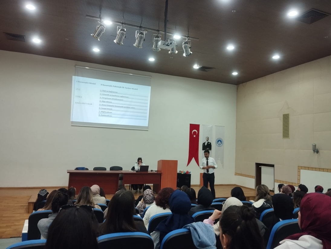 Sağlık Bilimleri Konferans Salonu’nda düzenlenen eğitimde, afet ve acil durumlarda psikososyal desteğin önemi, kriz anlarında doğru yaklaşım yöntemleri ve bireylerin ruhsal iyilik halinin korunmasına yönelik uygulamalar ele alındı.